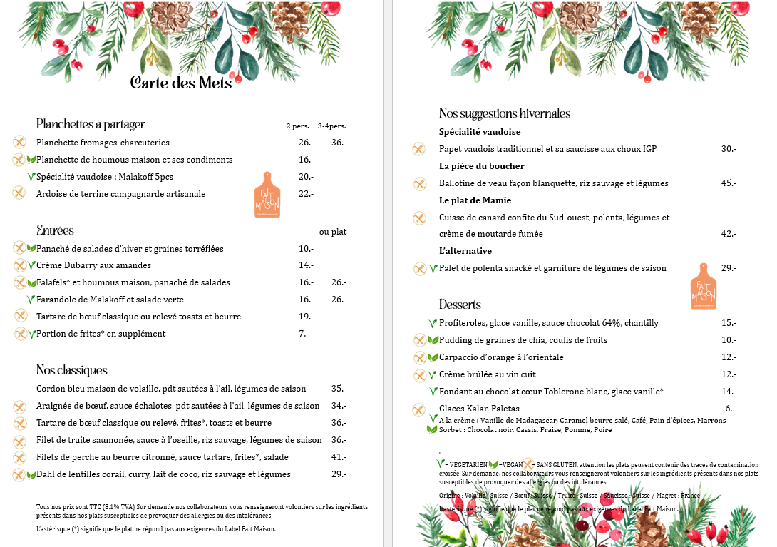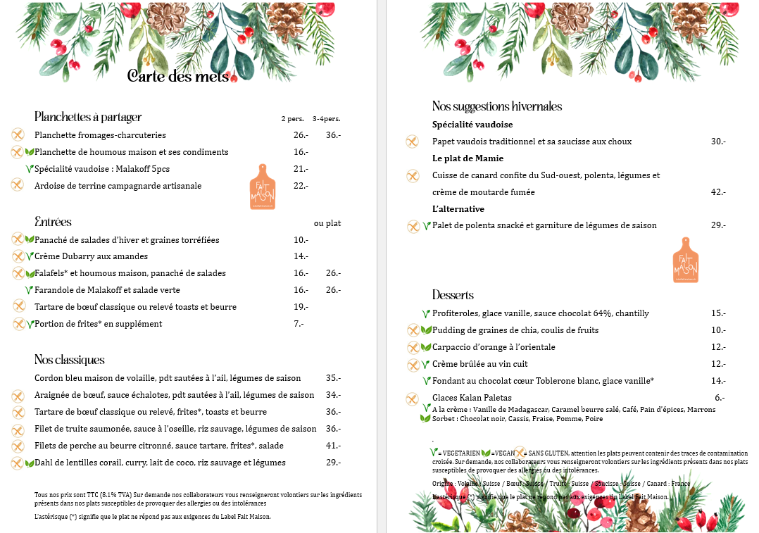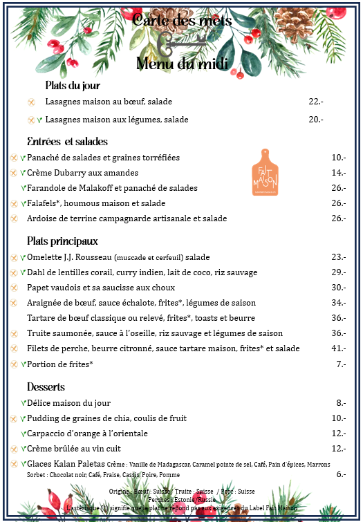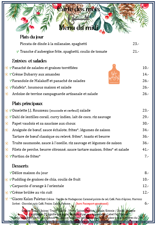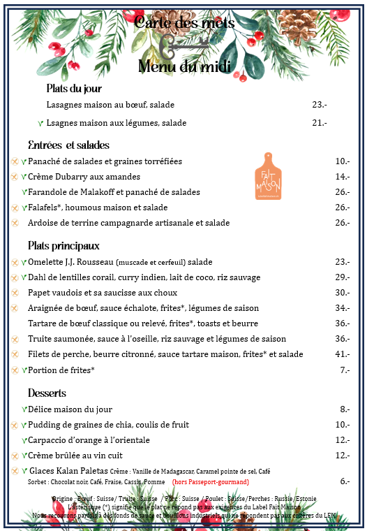 Vous pouvez ci-dessous voir la carte du midi, qui change donc toutes les semaines de plat du jour, en gardant tout de même une alternative classique et une alternative végétarienne!